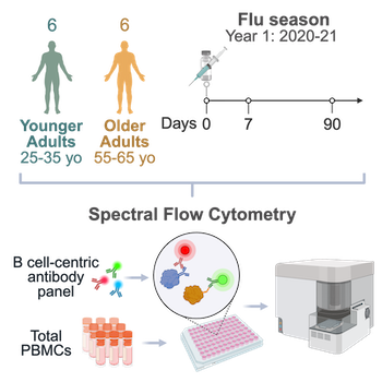 We used spectral flow cytometry to evaluate B cell phenotypes and frequencies in healthy young adults and older adults from the Sound Life cohort, at homeostasis (day 0) and during early (day 7) and late (day 90) flu vaccine response timepoints. The flu vaccine samples were collected in the 2020-2021 season. Flow cytometry was performed using a 23 color panel of antibodies and dyes on a Cytek Aurora spectral flow cytometer. Antibodies, fluorophores, dyes, and source information are provided below: