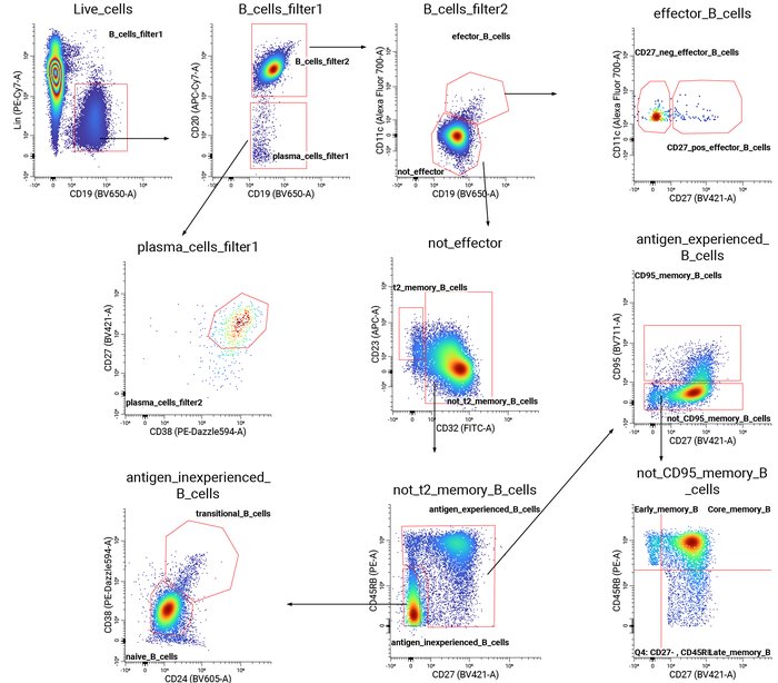 To analyze changes in cell type abundance across age cohorts, we gated specific B cell subpopulations. Cells were gated using a standard lymphocyte, singlet and live cell gating before reaching the first B cell gate (B_cells_filter1). The gating diagrams below show how B cell populations were identified: