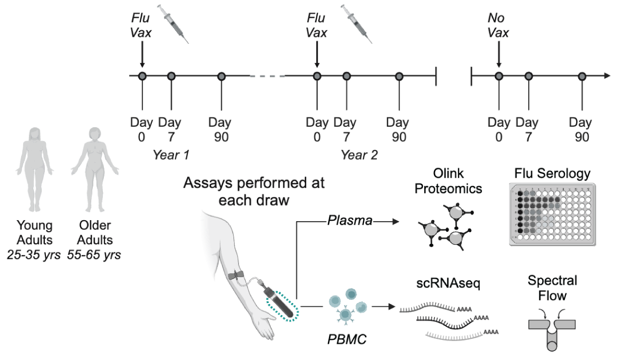 Samples were collected longitudinally to follow changes in peripheral immune state over time. Subjects were administered annual influenza vaccinations (Flu Vax), and samples were collected on the day of vaccination, 7 days post-vaccination, and 90 days post-vaccination. In addition to vaccine time courses, we also collected "No Vax" samples, which were collected with the same timing as flu vaccination sampling, but during periods when no vaccine was administered.