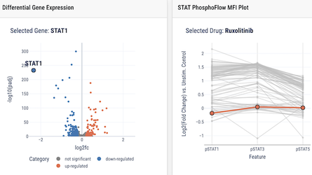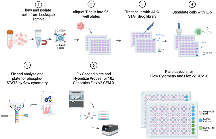 To better understand IL-6/STAT3 pathway in human T cells, we isolated T cells from PBMCs, placed them in a 96-well plate, then treated them with a panel of 88 JAK/STAT pathway inibitors for 1 hour. After drug treatment, we stimulated the T cels with IL-6. We then profiled the response to IL-6 using two assays: a phospo-STAT flow cytometry assay, and 10x Genomics Flex v2 scRNA-seq. For scRNA-seq, each sample in the 96-well plate was labeled with a distinct Barcode oligo, and cells from all 96 wells were then pooled and processed simultaneously on 4 wells of a GEM-X chip. This resulted in a dataset of ~4.2 million single cells with a panel of ~1900 genes, and paired flow cytometry data which showcases our high-throughput, high-plexity screening capabilities as well as the capabilities of the new 10x Genomics Flex v2 GEM-X chemistry.