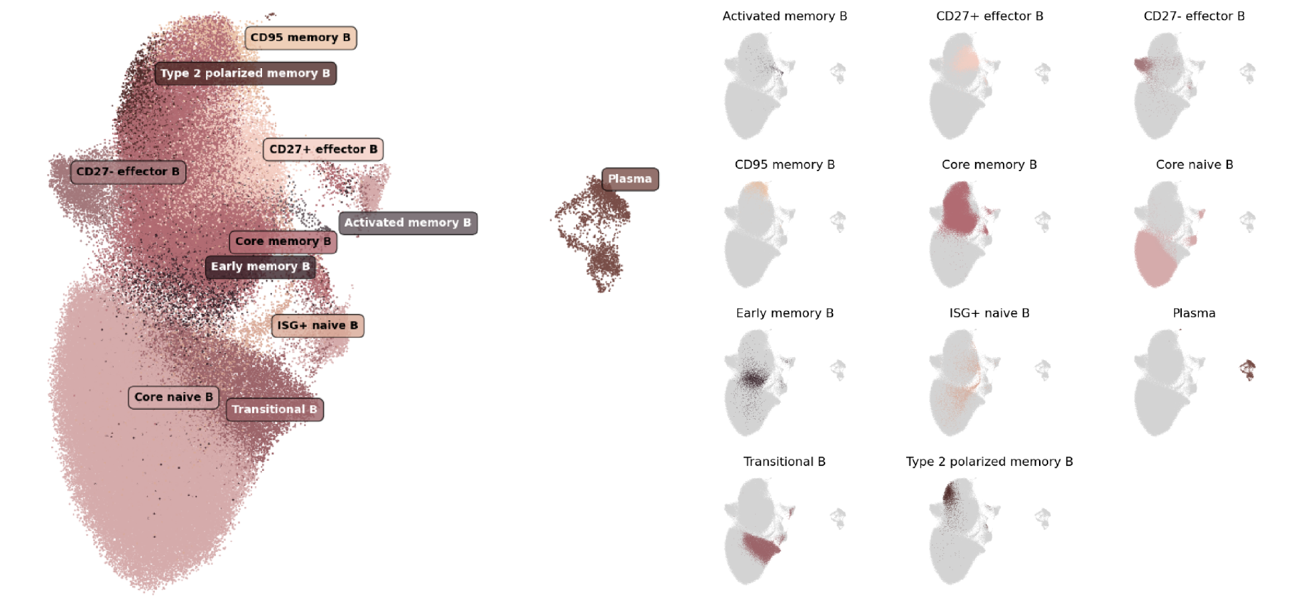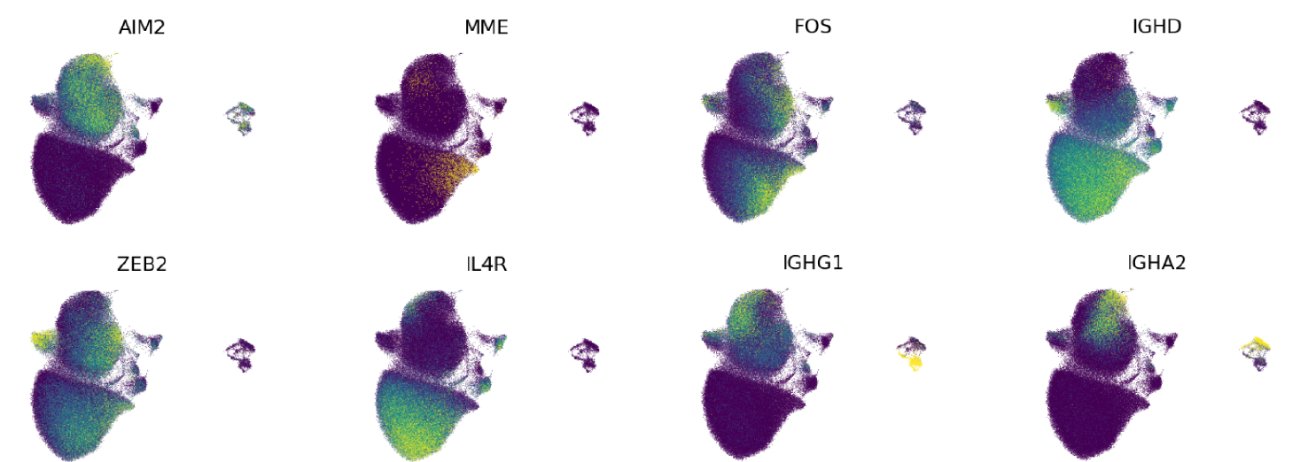 - Plasma cell: This antibody-producing population is clearly distinguishable from the rest of the B cell compartment due to a large number of unique transcriptional features (Nutt et al. 2015; Phad et al. 2022; King et al. 2021). As mentioned earlier, this subset lacks expression of MS4A1 (also known as CD20) and PAX5, which are ubiquitously expressed by all other B cell populations. However, these cells sustain expression of another B cell lineage-defining receptor gene, CD19, when in the absence of immune perturbations such as vaccination or infections. Plasma cells also express subset-defining transcription factor and regulatory protein genes, namely PRDM1, XBP1, MZB1, and SLAMF7. Finally, these cells have especially high expression of the CD27 and CD38 genes as well as most of the BCR heavy chain constant region genes, excepting for less IGHD transcript.