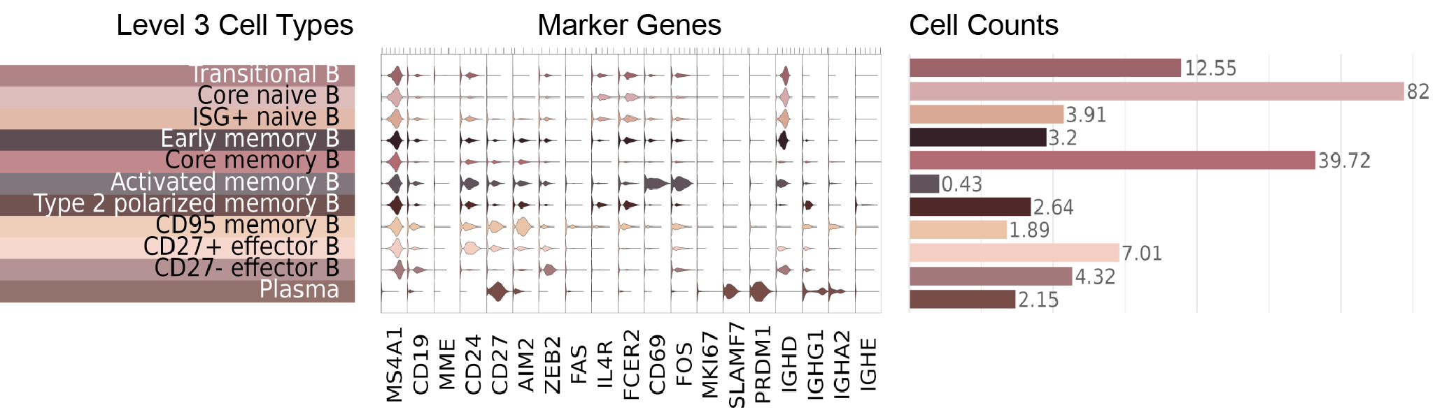 In our cell type atlas, we define B cell and Plasma cell types at 3 levels of resolution, from one Level 1 type (broadest) to 11 Level 3 types (highest resolution) based on marker gene expression and cell types previously described in literature. Descriptions of the marker expression criteria are provided below.