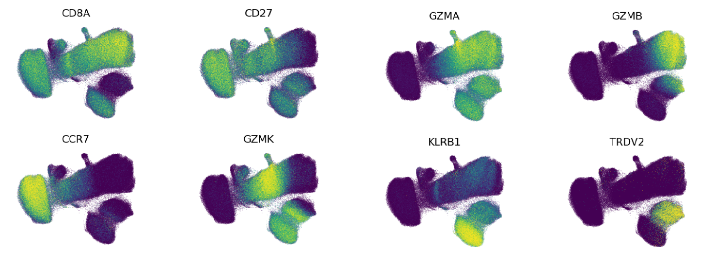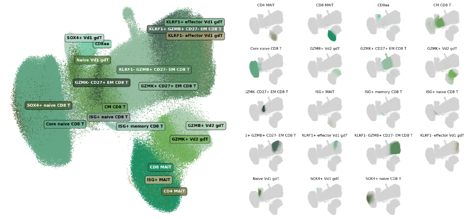 - CD8aa: CD8 alpha-alpha (CD8aa) T cells are a recently-described subset of alpha-beta T cells with effector-like properties (Thomson, et al., 2023; Terekhova, et al., 2023). These cells are defined by expression of high CD8A, KLRC2, IKZF2, and IL21R, and is closely associated with certain gdT cell subsets. (Thomson, et al., 2023)