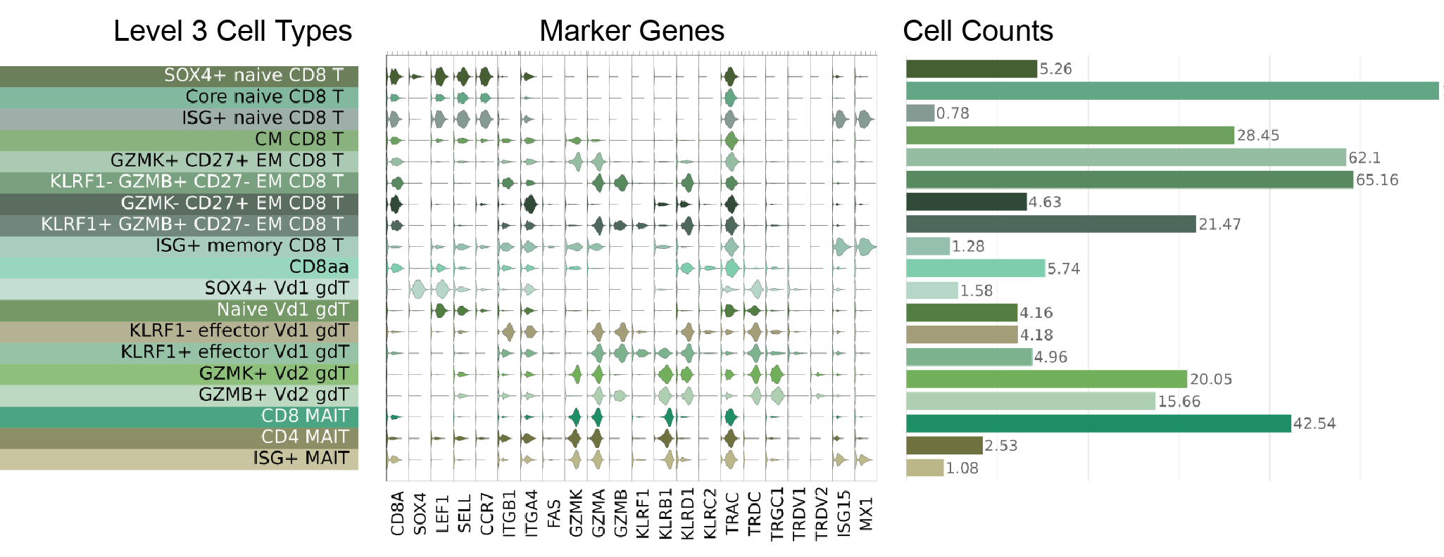 In our cell type atlas, we define CD8 T cell, gdT cell, and MAIT cell types at 3 levels of resolution, from one Level 1 type (broadest) to 19 Level 3 types (highest resolution) based on marker gene expression and cell types previously described in literature. Note that additional cell types are also derived from the Level 1 T cell type class, and are described in a separate page for CD4, Treg, and DN T cell types .