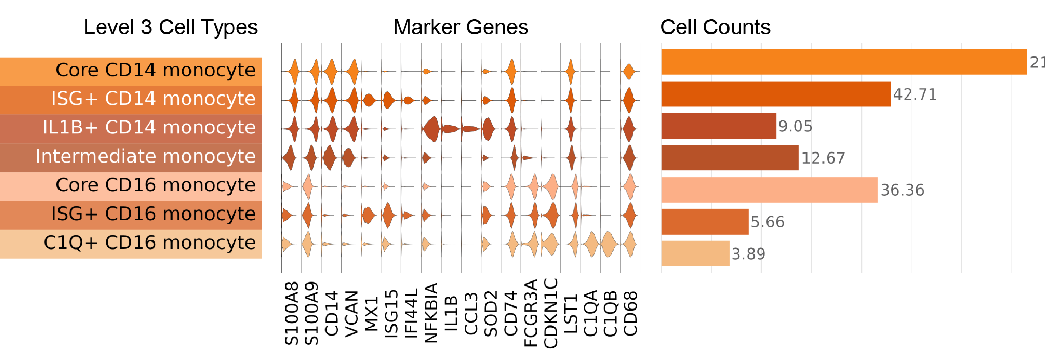 At Level 2, we subdivided Monocytes into 3 major subclasses that are identified and most studied in PBMCs by surface protein expression of CD14, CD16, HLA-D, and CCR2 (Schmidl, et al. 2014; Villani, et al. 2017; Kapellos, et al. 2019).