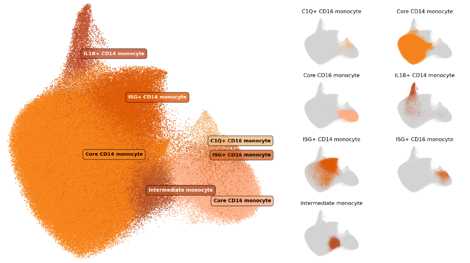 - Core CD14 monocyte: The remaining CD14 monocytes that did not express the distinct transcriptome signatures for IL1B+ or ISG+ CD14 monocytes were assigned the Core CD14 monocyte label.