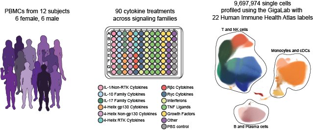 Parse Biosciences utilized their GigaLab platform to profile 90 cytokine perturbations in peripheral blood mononuclear cells (PBMCs) from 12 human donors. After sequencing, data assembly, and quality control with the Parse Analysis Pipeline, the resulting dataset consists of transcriptomic profiles from ~10 million PBMCs.