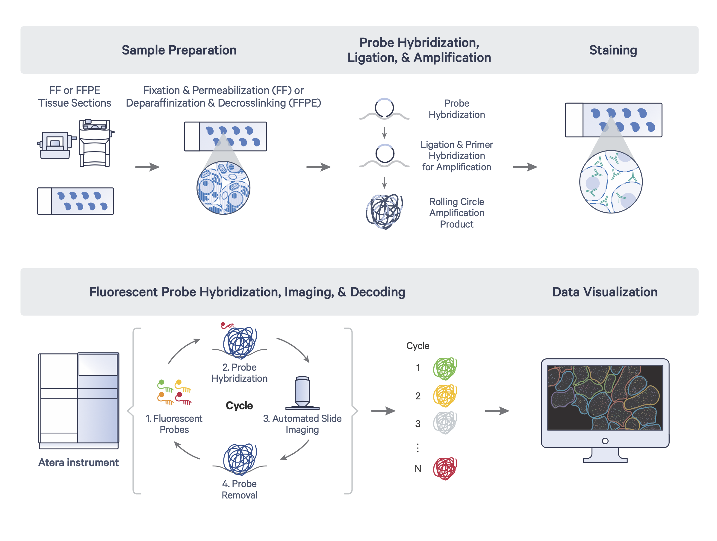 Atera profiling of tissue sections was carried out by 10x Genomics, including sample perparation, probe hybridization, ligation and amplification, staining, and fluorescent probe hybridization, imaging, and decoding: