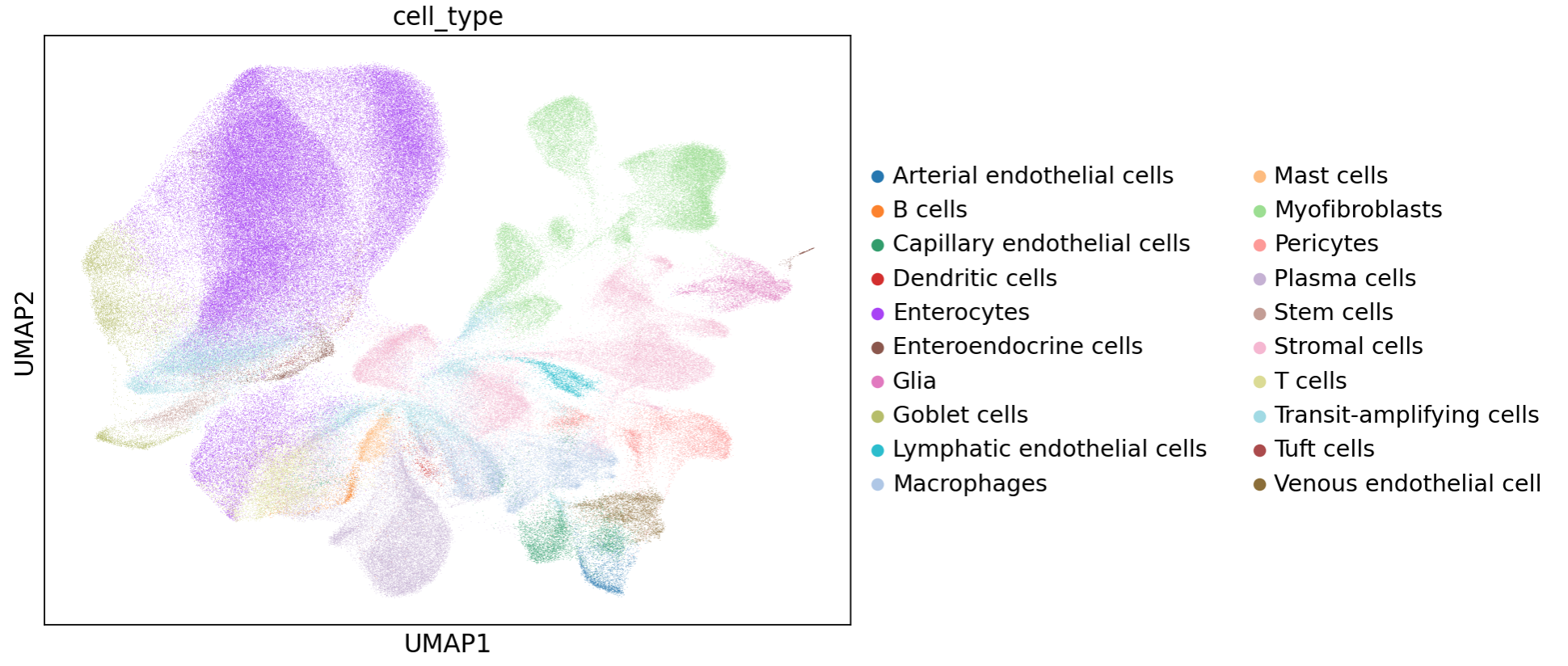 To apply cell type labels, we utilized the scanpy functions scanpy.pp.normalize_total() with the parameter target_sum = 1e4, followed by scanpy.pp.log1p(). We performed label assignment using the CellTypist package, and utilized the cell type model for Intestine provided as part of the CellHint auto-harmonised and auto-integrated Organ Atlas resource (specifically, the "All combined model"). Cell type prediction was performed using the celltypist.annotate() function with the majority_voting = True parameter. Majority voting labels were used as a first pass for label assignment, followed by manual curation to combine highly related categories to identify 20 initial cell types. We expect further analysis will yield confident, high-resolution cell type assignments.