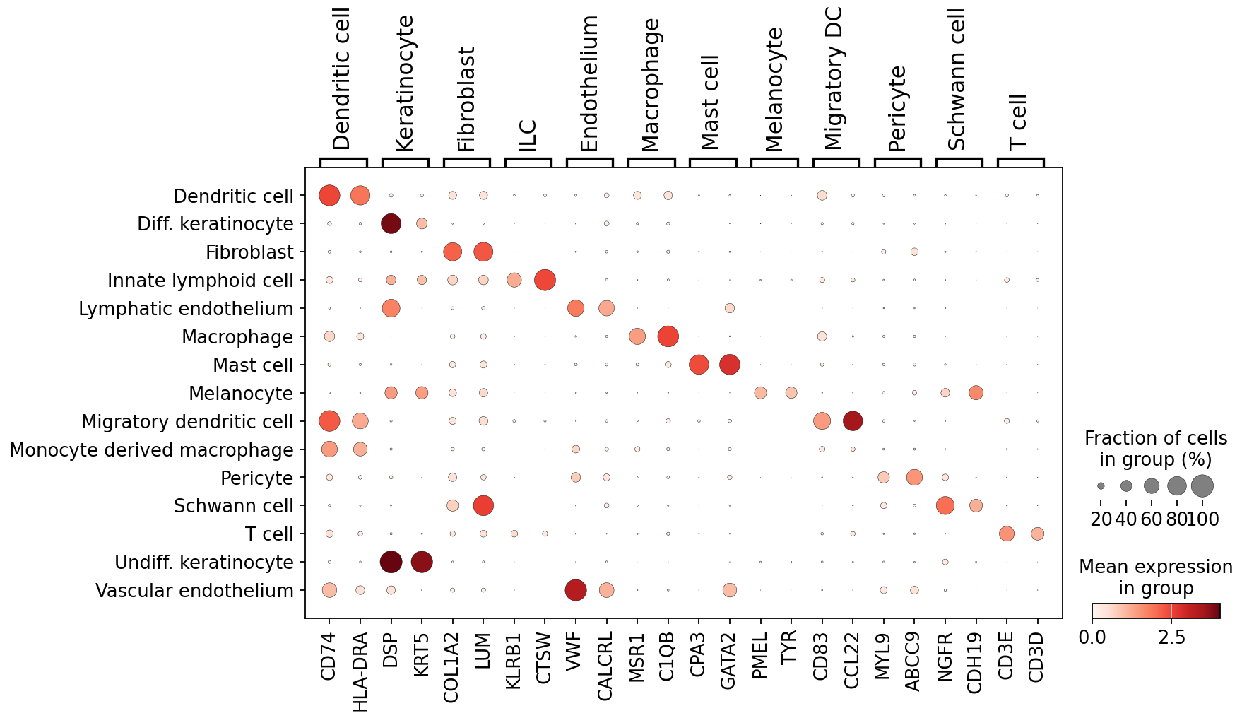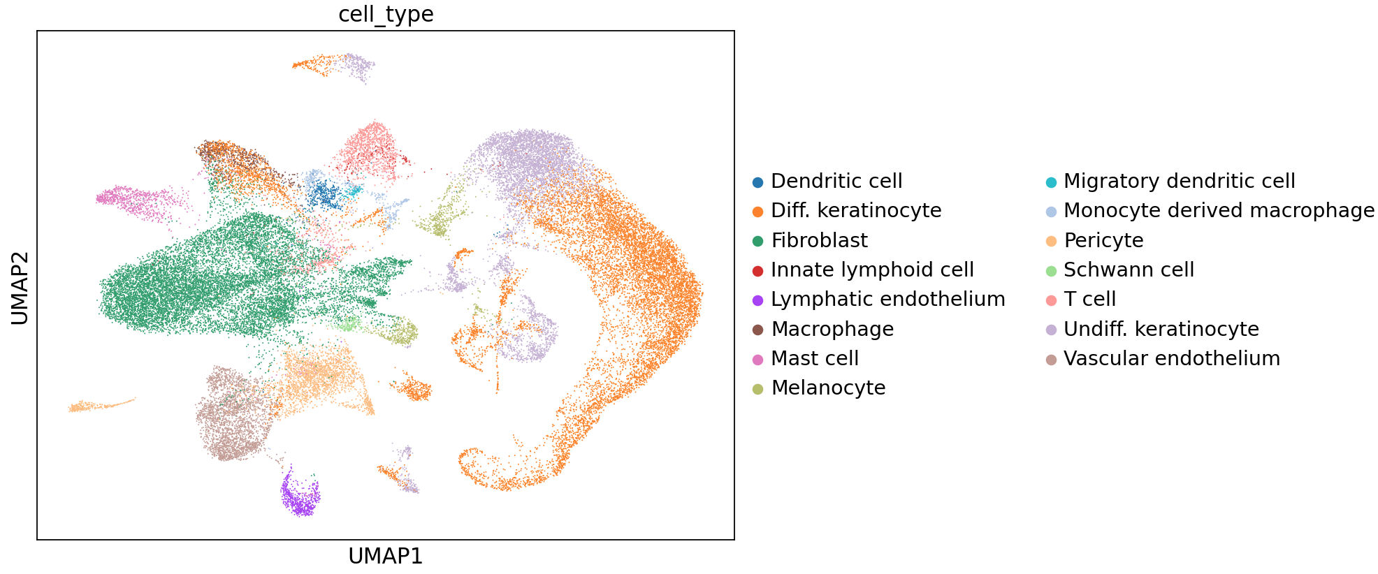 As described for duodenum, labeling was performed using CellTypist predictions with majority_voting = True. For skin, we utilized the Adult_Human_Skin model provided on the CellTypist website in the Models section. After prediction, majority voting, and label merging, we identified 15 cell types. As for duodenum, we performed dimensionality reduction to visualize these cells: