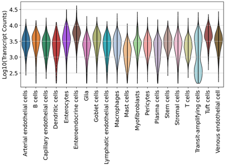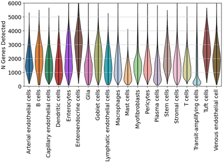 After labeling, we inspected the distributions of transcript and gene detection across duodenum cell types.