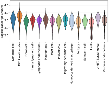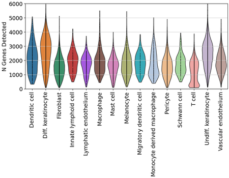 Finally, we also examined transcript and gene detection across skin cell types. We see variation in transcript and gene detection across cell types, which will need to be further examined.