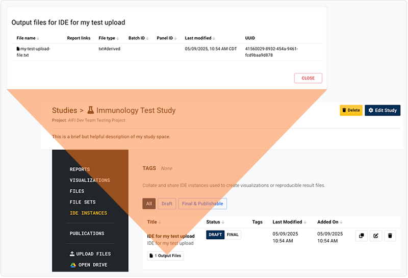 4. This view shows all the notebooks that have uploaded data or visualizations to your study by calling hp.upload_files(), hp.save_dash_app(), or hp.save_visualization(). To see the output files associated with a given IDE, click Output Files.