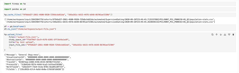 10. In the next cell, enter your hp.upload_files() call with the four required parameters, including the input_file_ids from Step 1.7 and the study_space_id from Step 1.9. You can copy the code below (left). The image at right shows an example hp.upload_files() call. For a list of upload_files parameters, see Step 2 in Use the Upload Files SDK Method (Tutorial).