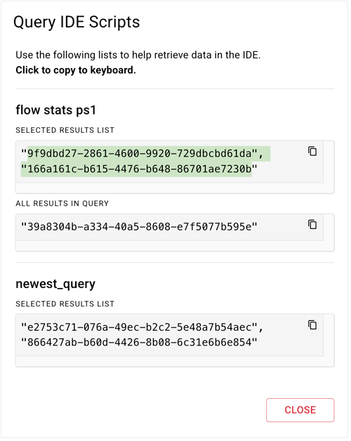 B. In the Query IDE Scripts dialog box, copy the input file IDs.