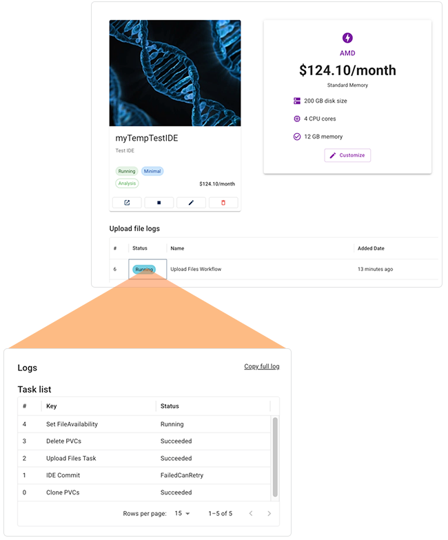C. To drill down into the upload files workflow, click the Running tag. Your IDE will appear in the IDE Instances side navigation only after all processes have succeeded.