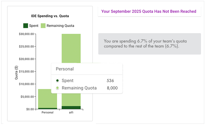 A. To learn what percentage of the team's quota you've spent (in this case, 6.7%), review the IDE Spending vs. Quota bar chart.