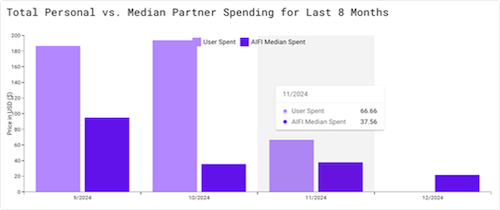 C. For the precise dollar amount of spending in a single month, hover over the selected month. This user, for example, spent $66.66 in November, compared with median team spending of $37.56 the same month.