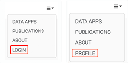 2. From the navigation menu, click LOGIN (left). Use your institutional email address or a gmail address. After you log in, or if you are already logged in, the menu shows PROFILE (right).
