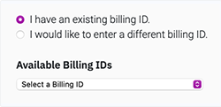 A. Click I have an existing billing ID, and choose your ID from the drop-down list.