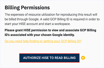 5. On the Billing Permissions page, to authorize HISE to view and associate your GCP billing ID with the selected Google identity, click AUTHORIZE HISE TO READ BILLING.