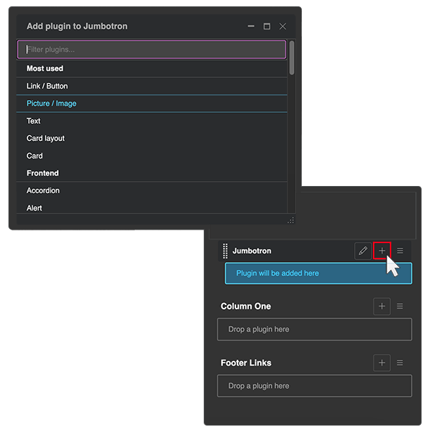 2. In the Content side panel, click the plus (+) sign to the right of the Jumbotron, and choose Picture/Image.