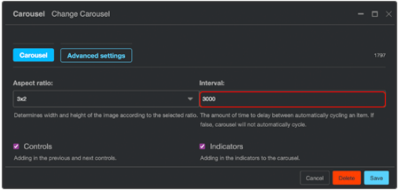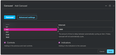 2. In the Carousel dialog box, from the Aspect ratio field, click the arrow to select the image proportions from the drop-down list. Choose 1:1 for square images. Choose 21x9 or 18x9 for the best viewing experience on widescreen monitors. An aspect ratio of 3x2 or 4x3 is suitable for landscape-oriented images viewed on smaller devices.