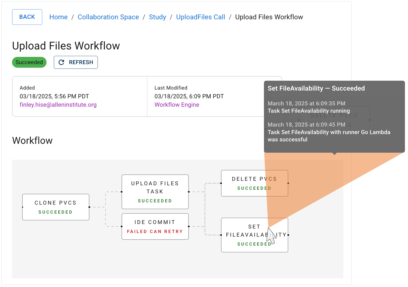 For detailed information on the status of your calls, the upload files workflow UI includes a banner, list view, and workflow details view. Together, these components describe the status of each upload files call for a given study. Get an overall snapshot of your calls, or drill down as far as you like on calls of particular interest.