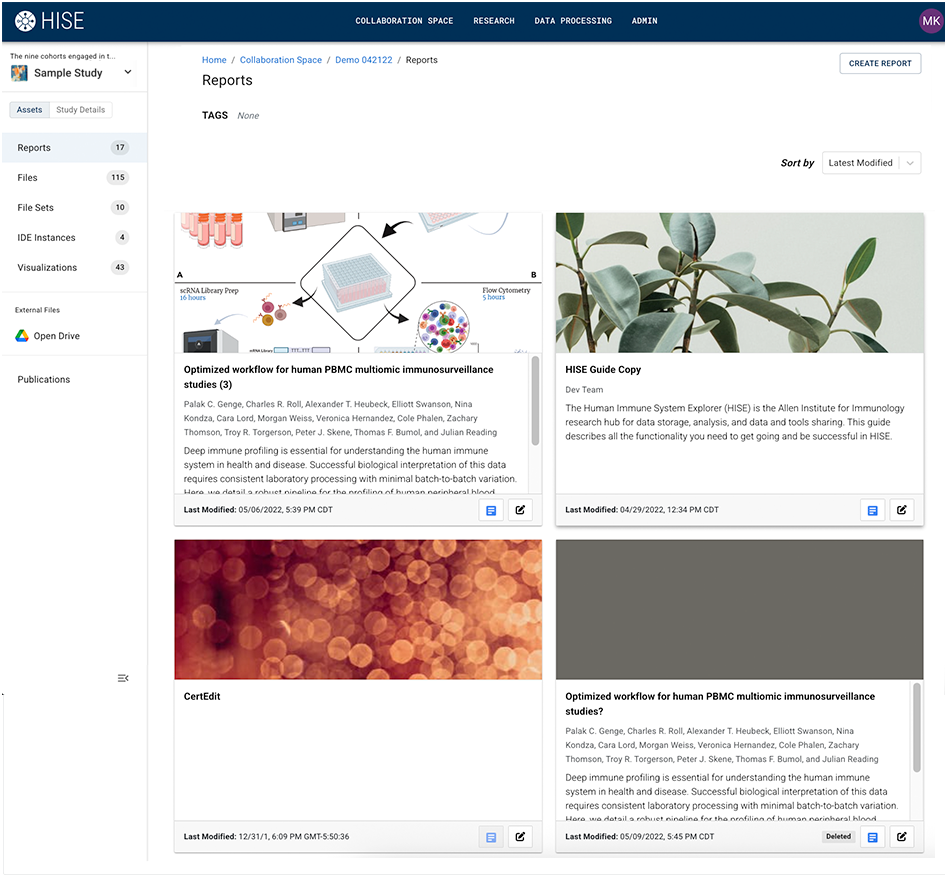 Studies are part of the HISE Collaboration Space. They contain documents, data, visualizations, research methods, statistics, notebooks, and other project materials. The following image shows the Reports section of a typical HISE Collaboration Space, which offers a shared, permanent workspace for specific lines of research.