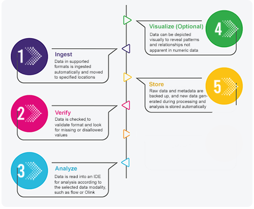 Lab results and other data can be read into an IDE for analysis according to the selected data modality. At this stage, scientists or analysts use sophisticated computational methods to explore the data. For example, they might identify biomarkers, analyze differential protein expression, or create scripted workflows. Sometimes they generate visualizations to investigated selected datasets, as described in the next step.