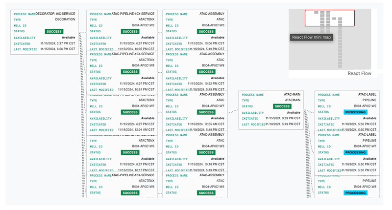 i. To see a different part of the pipeline on your screen, click, hold, and drag the pipeline image. The visible portion of the image is highlighted in the React Flow mini map.
