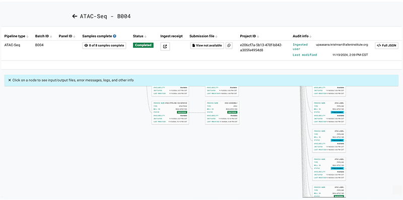 1. In the pipeline dashboard, you can view the status of each process in the pipeline run, find input/output files, and review error logs if problems occur. When a pipeline run is complete, or if a process fails, you're notified by email. To view the dashboard, go to the main navigation menu in HISE, and select Data Processing > Pipeline dashboard.