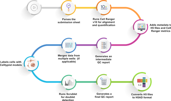 The 10x scRNA pipeline processes HISE scRNA-seq data. When you submit your sequencing data and a completed HISE submission sheet, the pipeline automatically handles alignment, quality control, metadata annotation, cell type labeling, doublet detection, and final file conversion, as shown in the image below. The result is a set of analysis-ready H5 and H5AD files.