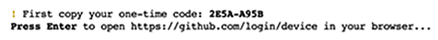 7. A one-time eight-digit GitHub activation code appears. (The code expires in 15 minutes, so now is not the time for a sushi run.) Click the link to open a browser window. If you get an error message, see the accompanying box.