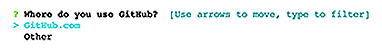 A. Question 1: Where do you use GitHub? To accept the default answer, GitHub.com, press Enter.