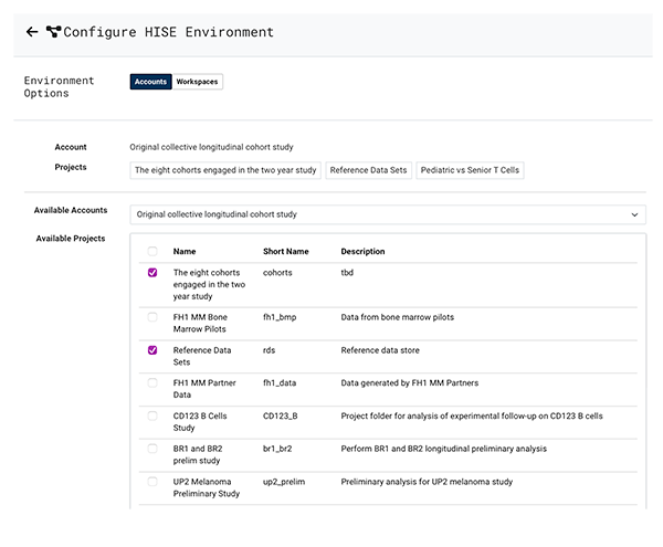3. On the Accounts tab, choose one or more projects you want to work with. (To select or deselect all projects, select or deselect the checkbox to the left of the Name field in the Available Projects box.)