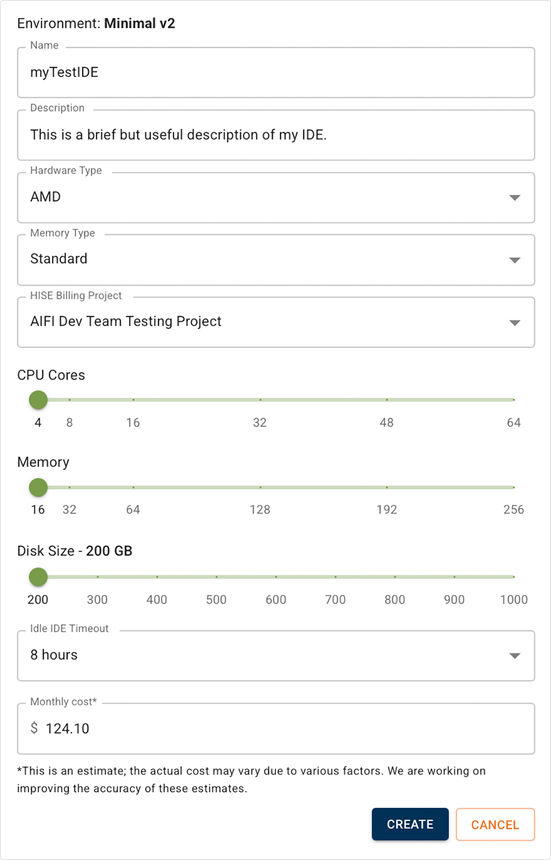 5. On the IDE Settings page, complete the requested fields. A. In the Name field, enter a name for your IDE. It must be at least 10 characters in length (maximum 255 characters). B. (Optional) In the Description field, enter a brief explanation of what the IDE will be used for. C. In the Hardware Type field, keep the default unless you prefer the alternative. D. In the Memory Type field, choose High Memory if you have plenty of memory available and want your functions to run faster, especially if you're working with large datasets. Otherwise, choose Standard. E. In the HISE Billing Project field, select the project that best matches the analysis you're working on. This field determines which project is billed for your IDE expenses. Project selection does not limit data availability. F. On the CPU Cores slider, choose the number of cores you want. (The standard configuration has 4 GB of memory per CPU core, and high memory has 8 GB per core.) The Memory slider adjusts automatically, and your estimated cloud billing cost appears in the Monthly cost field. G. On the Disk Size slider, accept the default size of 200 GB unless you need a larger size for your analysis. Expanding the default value significantly increases the monthly cost of your IDE instance. 6. Click CREATE. Nice! Now go grab a cup of coffee while your instance is created. It'll take just a few minutes.