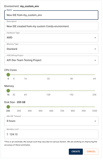 4. On the IDE Settings page, enter the requested information, and click CREATE. If you're not sure which settings to choose, see Create Your First IDE Instance (Tutorial).