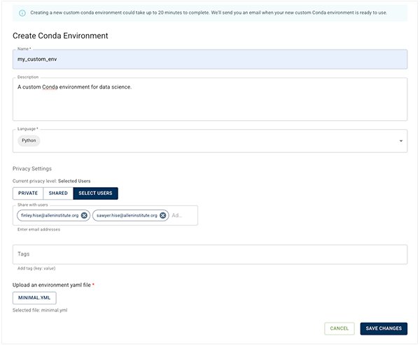 You can save your custom Conda environment programmatically, using the SDK (Method 1, preferred). If you're more comfortable with a manual approach, upload your YAML file through the HISE Conda Environments UI (Method 2, optional) You do not need to do both.