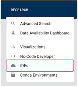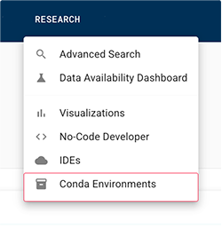 A. From the top navigation menu in HISE, click RESEARCH > Conda Environments.