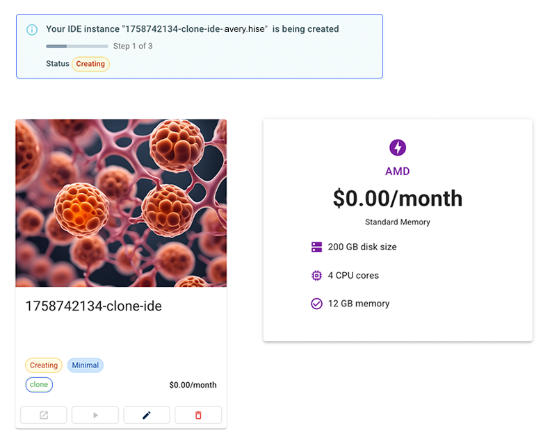 Cloning in Fast ModeIDEs uploaded using fast mode still clone correctly, but cloning takes longer because the previously skipped build time shifts to the cloning stage. Behind the scenes, HISE tracks whether a given IDE or certificate run used fast mode so that the cloning experience can adapt accordingly. When you or a collaborator clones a fast‑mode IDE (including from a Certificate of Reproducibility), HISE automatically uses the stored As the clone builds, you can track its progress in HISE, as shown in the accompanying image. In the top navigation bar, click RESEARCH, and select IDEs from the drop-down menu. Then click the card for your study to see a status message similar to the one here.