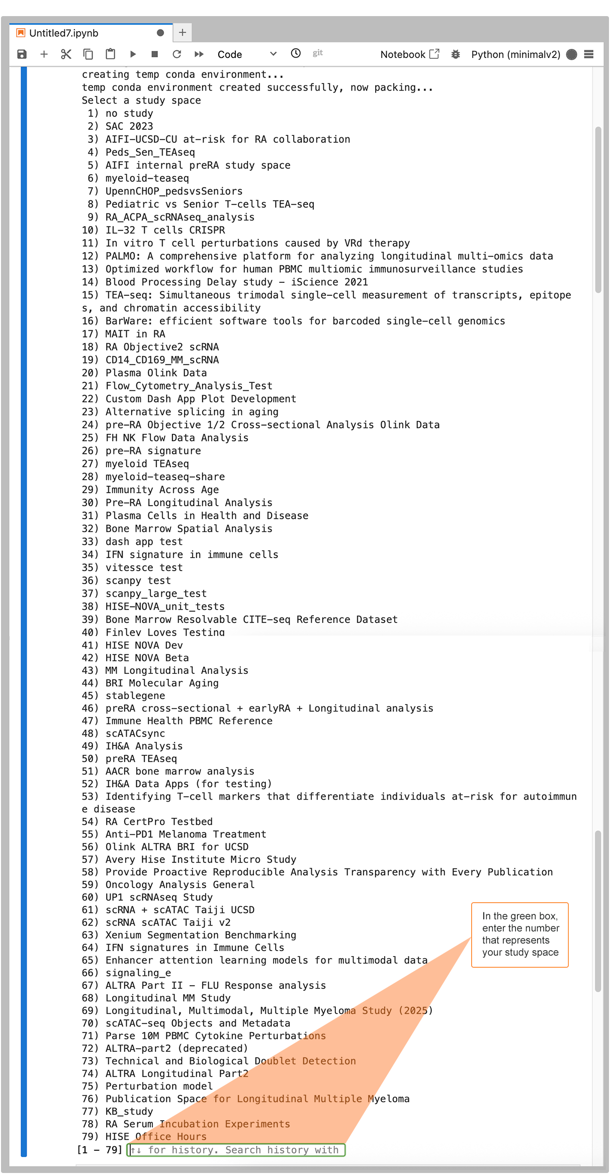 1. To find your study space ID, enter the following code. A list of dictionaries is returned.