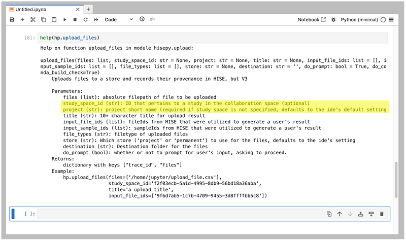 The upload_files method lets you specify certain parameters in alternative ways. To indicate where files should be uploaded, for example, you can provide either a study_space_id or a project (highlighted)–but not both. If you're not sure which parameter is required or how to format it, use help(hp.upload_files) to review the SDK help documentation, as shown in the following image. In addition, check the HISE documentation shown in the Related Resources section at the bottom of this page.