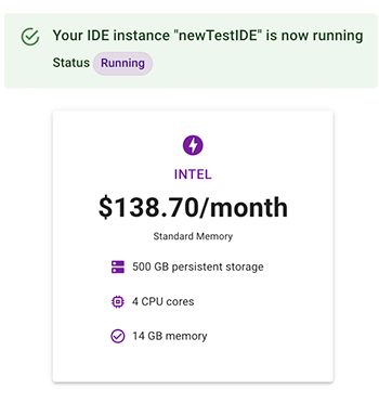 To check the status of your IDE on the IDEs screen, find the card for your IDE, and click the tag in the lower-left corner. This action opens a screen that confirms the status of your instance, displays the specs you chose when you created the instance, and shows the estimated monthly cost of running the instance. The accompanying screenshot, for example, confirms that the instance is active (Running), indicates that the VM has 500 GB of cloud storage (the private folder) and 14 GB of memory running on 4 CPU cores, and gives a monthly cost estimate of $138.70. Other possible status tags include Creating, Starting, Stopping, and Stopped. Visit the Billing section in HISE to see if you're in danger of exceeding your individual or team monthly cloud spending quota. For details, see Track Your IDE Billing Expenses (Tutorial).