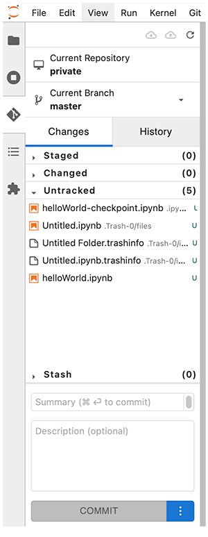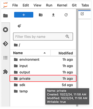 2. Click File > Save Notebook As, and enter the name of your notebook. The new file is automatically stored in a private folder (one folder per user per account) that's backed up to the cloud and version controlled with Git. You can find the private folder in the left navigation panel.