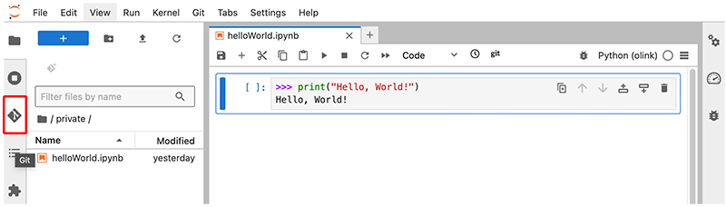 2. Click File > Save Notebook As, and enter the name of your notebook. The new file is automatically stored in a private folder (one folder per user per account) that's backed up to the cloud and version controlled with Git. You can find the private folder in the left navigation panel.