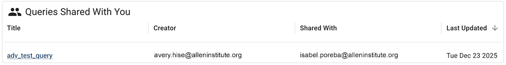 | Queries Shared With You | Shared with specified collaborators | Saved queries visible to the specified set of users or groups. Those collaborators can see and run the query. They might also edit or manage it, depending on their permissions, but the query is hidden from everyone else on the account. |