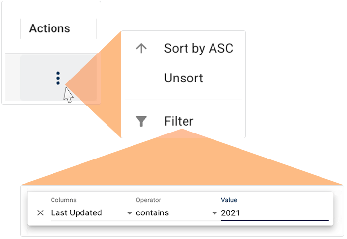The results area to the right of the filters shows matches in a tabular format. Table columns are context specific, depending on your search type and filter selections. To reduce clutter, table controls, such as column menus, appear only when you hover over them. For more options, click the ellipsis next to any table column heading. Select the columns displayed in the results window, hide columns to create a more compact view, filter the results, or re-sort the columns (for example, reorder batch IDs from descending to ascending).