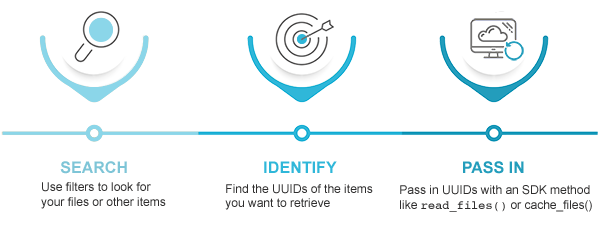 Advanced Search underpins several common research workflows, including assembling cohorts of subjects, selecting samples for analysis, and identifying files or reports to add to a study. Because filters are expressed in terms that match scientific and operational concepts, you can refine your queries until the results match your study design. When you have the results you want, you can move them into other parts of HISE. For example, you can save them within specific studies, create new file sets, or launch visualizations for exploratory analysis. Another option is to use an SDK method in R or Python to read or cache the files from an advanced search into your IDE. The typical pattern is shown in the accompanying image. For reproducibility, treat the saved queries themselves as research assets that document how a particular cohort or dataset was defined.