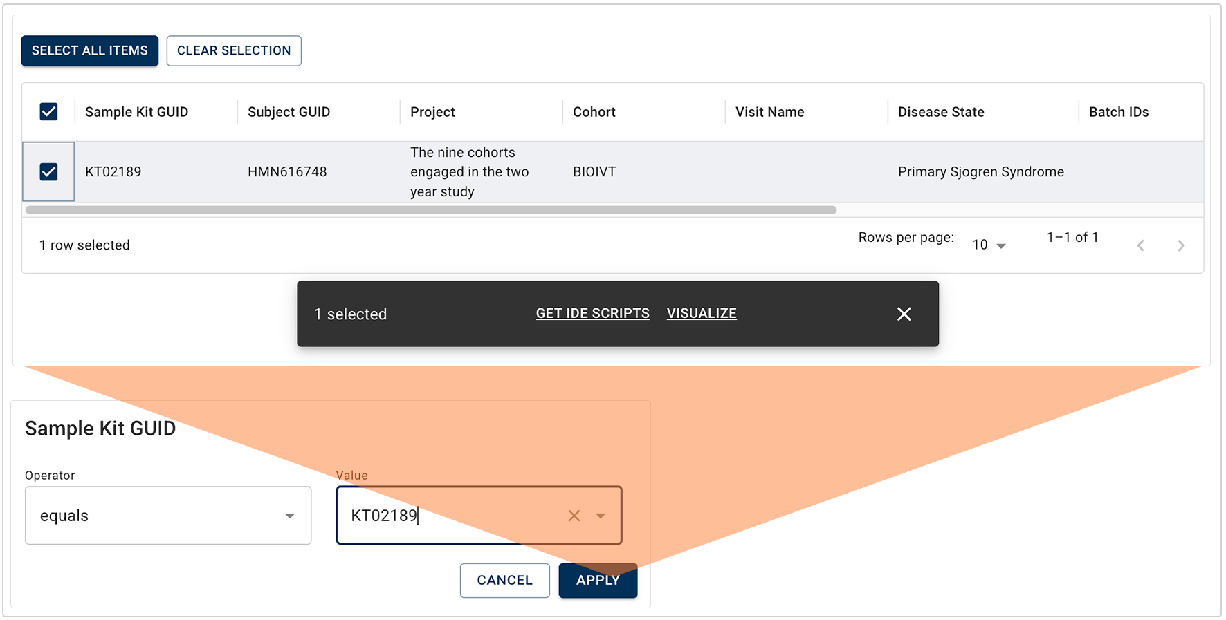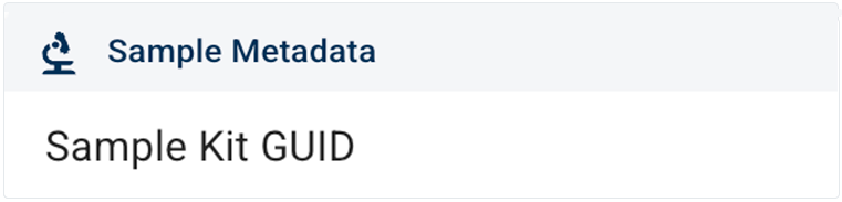 i. Here we chose Sample Kit GUID from the Sample Metadata filter group. (For a complete list of filters and instructions on using them, see Use Advanced Filters for Complex Search Queries (Tutorial).)